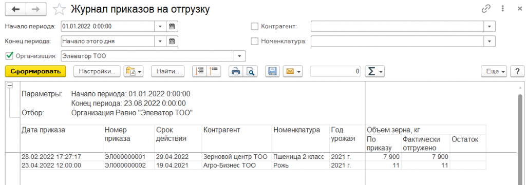 Просмотреть данные по количеству зерна, фактически отгруженному зерну и остатку зерна по приказам за определенный период можно с помощью отчета «Журнал приказов на отгрузку».