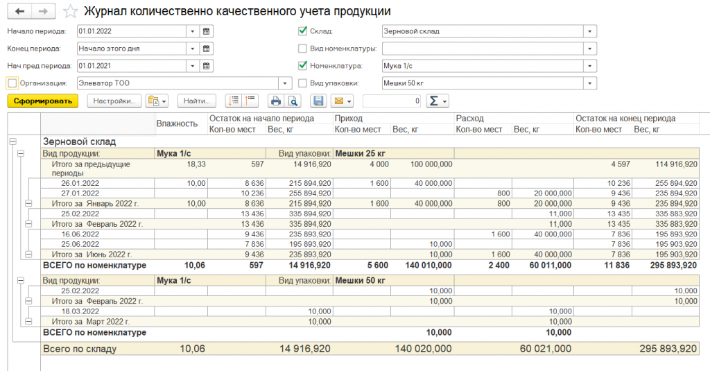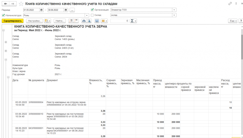 Отчет «Книга количественно-качественного учета зерна»