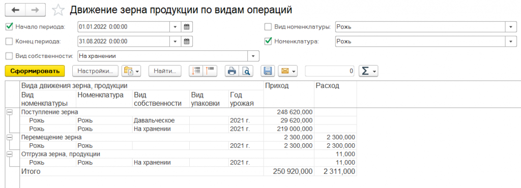 Отчет предназначен для отражения движения зерна (собственного, на хранении, давальческого и государственного), с детализацией по продукции (собственной и давальческой) за указанный период.