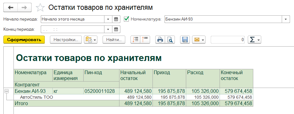 Проанализировать остатки и обороты нефтепродуктов на хранении, с детализацией по владельцам за указанный период можно при помощи отчета Остатки товаров по хранителям.