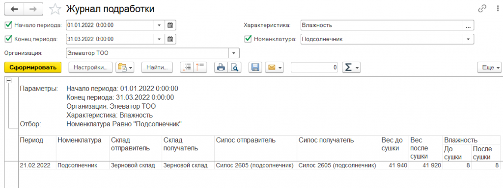 Специализированная отчетность позволяет получать данные внутренних учетных регистров подсистемы «Элеватор» (средневзвешенное качество зерна, движение зерна и продукции, остатки товаров по хранителям, давальческий расчет, разработочная ведомость и т.д.).