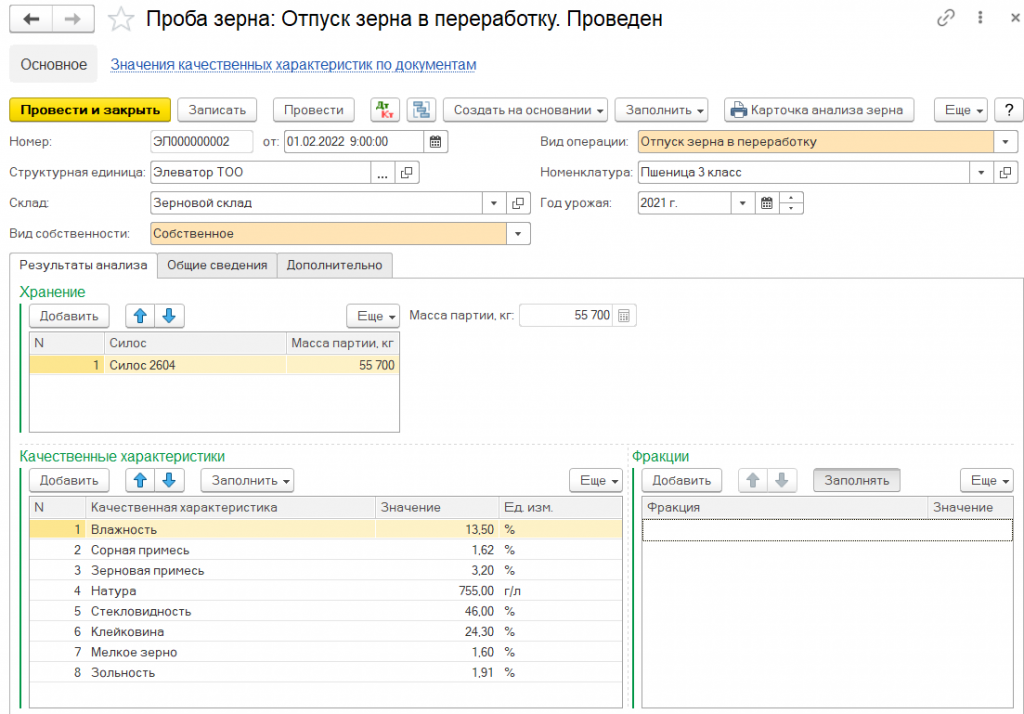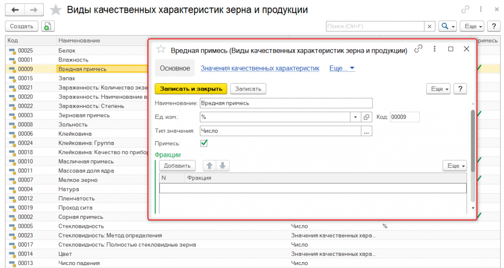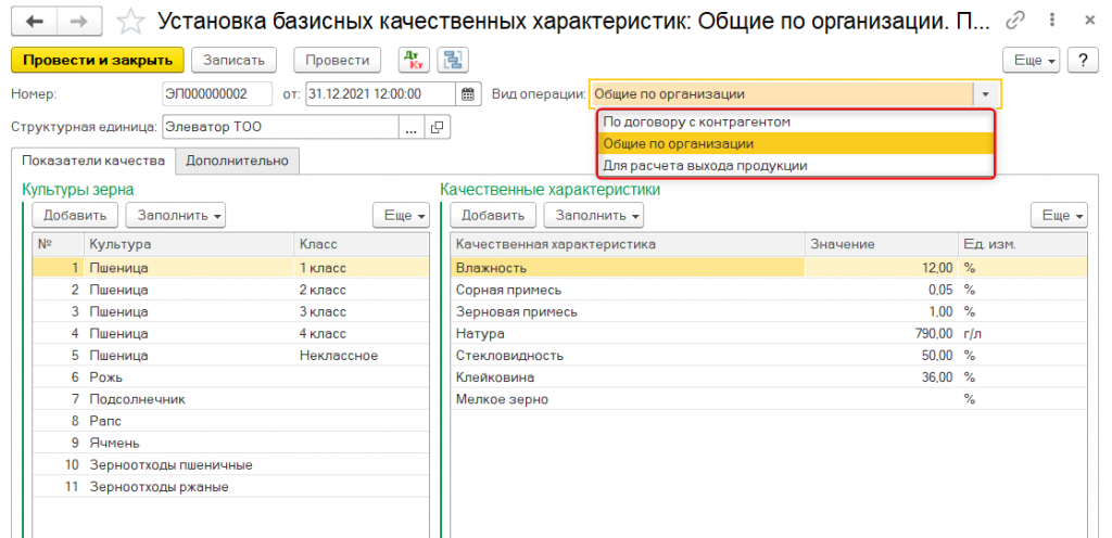 В конфигурации предусмотрен набор справочников для учета дополнительных характеристик зерна (классы, типы, подтипы, сорт, происхождение и т.д.).