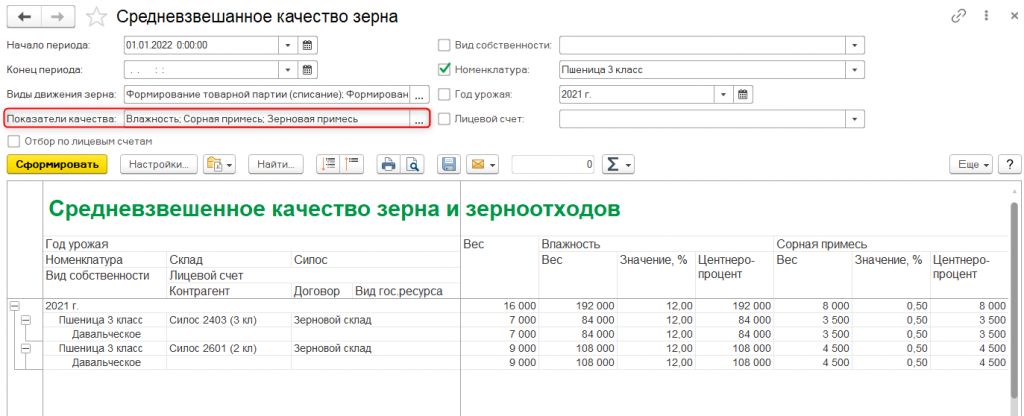 Получить информацию о средневзвешенном качестве поступившего зерна, по данным качества отгруженного с хранения зерна и по данным качествам зерна, регистрируемого при списании зерна в переработку можно с помощью отчета Средневзвешенное качество зерна.