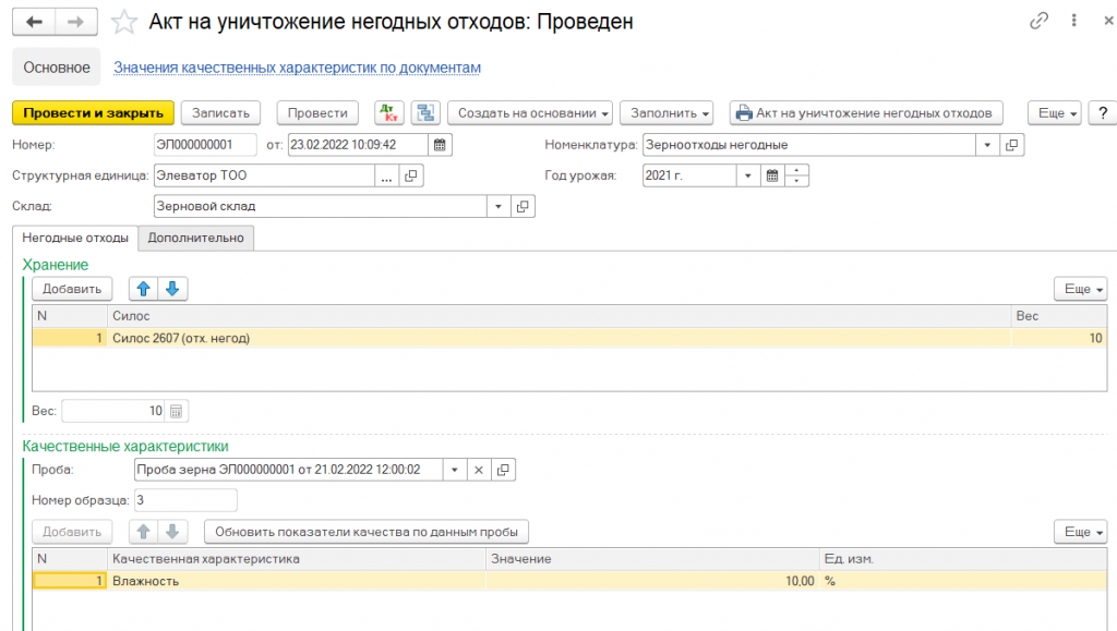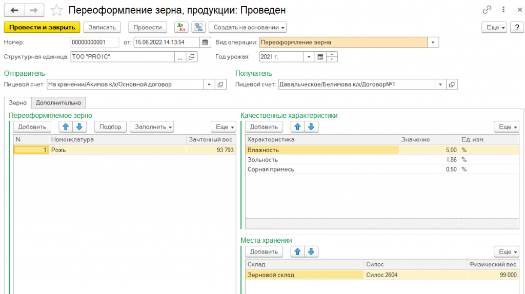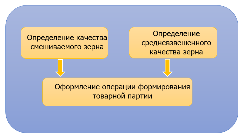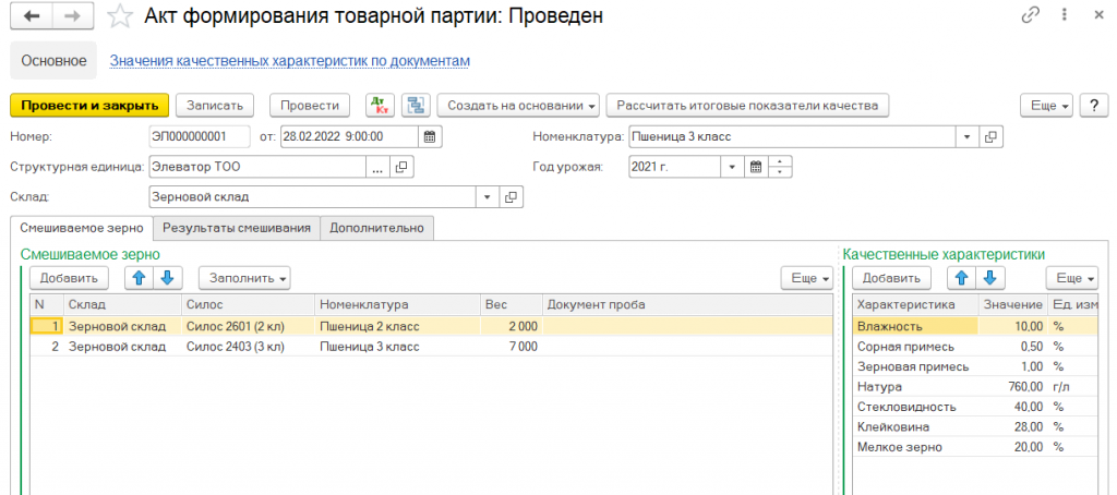 По желанию владельца зерна может быть оформлена операция по смешиванию зерна разного класса и качества и регистрации новой партии зерна с общим количеством и средневзвешенным качеством.