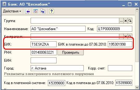 Сведения о прежнем БИК и прежнем коде Банка в платежной системе сохраняются в отдельных полях справочника Банки: «БИК в платежах до 07.06.2010» и «Код в платежах до 07.06.2010».
