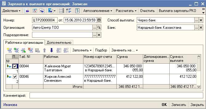 При автозаполнении документов на перечисление заработной платы используется основной карт-счет работника в конкретном банке. Перечень основных карт-счетов можно увидеть в карточке сотрудника на закладке «Дополнительная информация».