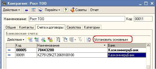 После 7 июня 2010 года можно установить в качестве основного счета один из новых счетов контрагента. Для этого в форме списка банковских счетов на закладке «Счета и договоры» нужно выделить нужный счет и нажать кнопку «Установить основным» в командной панели списка счетов.