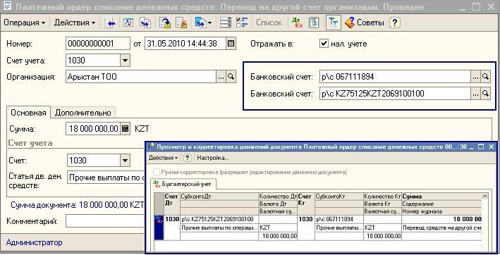 В случае если по каким-либо причинам хотелось бы сохранить историю платежей по старому номеру расчетного счета, можно поступить по аналогии с процедурой перехода, приведенной выше в отношении банковских счетов поставщиков/покупателей. Новые номера банковских счетов собственной организации указываются на закладке «Счета» в форме организации. При этом, поскольку учет денежных средств на счетах 1030 «Денежные средства на текущих банковских счетах», 1040 «Денежные средства на карт-счетах», 1050 «Денежные средства на сберегательных счетах», 1060 «Прочие денежные средства» ведется в разрезе банковских счетов, дополнительно потребуется переместить остатки денежных средств с одного счета на другой (со старого счета на новый) в бухгалтерском учете. Операцию можно отразить с помощью документа «Платежный ордер (списание денежных средств)».