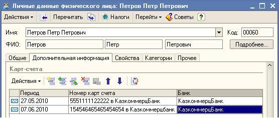 В версии 1.5.17.8 Бухгалтерии 8 для Казахстана появилась возможность использования нескольких карт-счетов для одного сотрудника, в том числе открытых в одном и том же банке. Полный перечень карт-счетов сотрудника указывается в справочнике «Карт-счета физических лиц» (меню Кадровый учет — Карт-счета физических лиц).