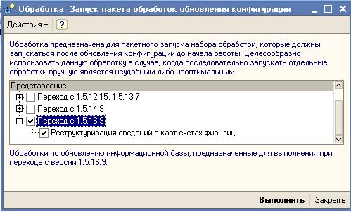 При установке обновления 1.5.17.8 производятся операции по реформации сведений о карт-счетах сотрудников: заполнение справочника «Карт-счета физических лиц» и установка периода записей регистра сведений «Карт-счета». Для запуска этой операции в форме пакета обработок обновления конфигурации необходимо выполнить пункт «Реструктуризация сведений о карт-счетах физ. лиц».